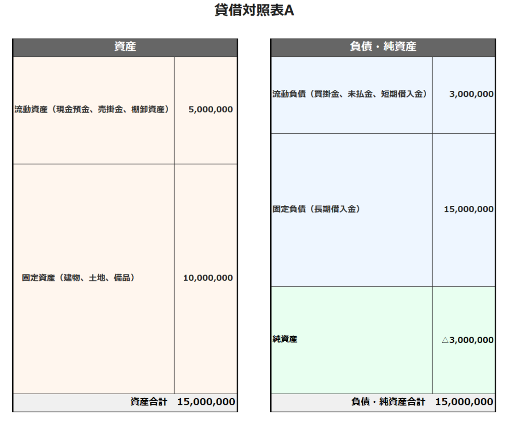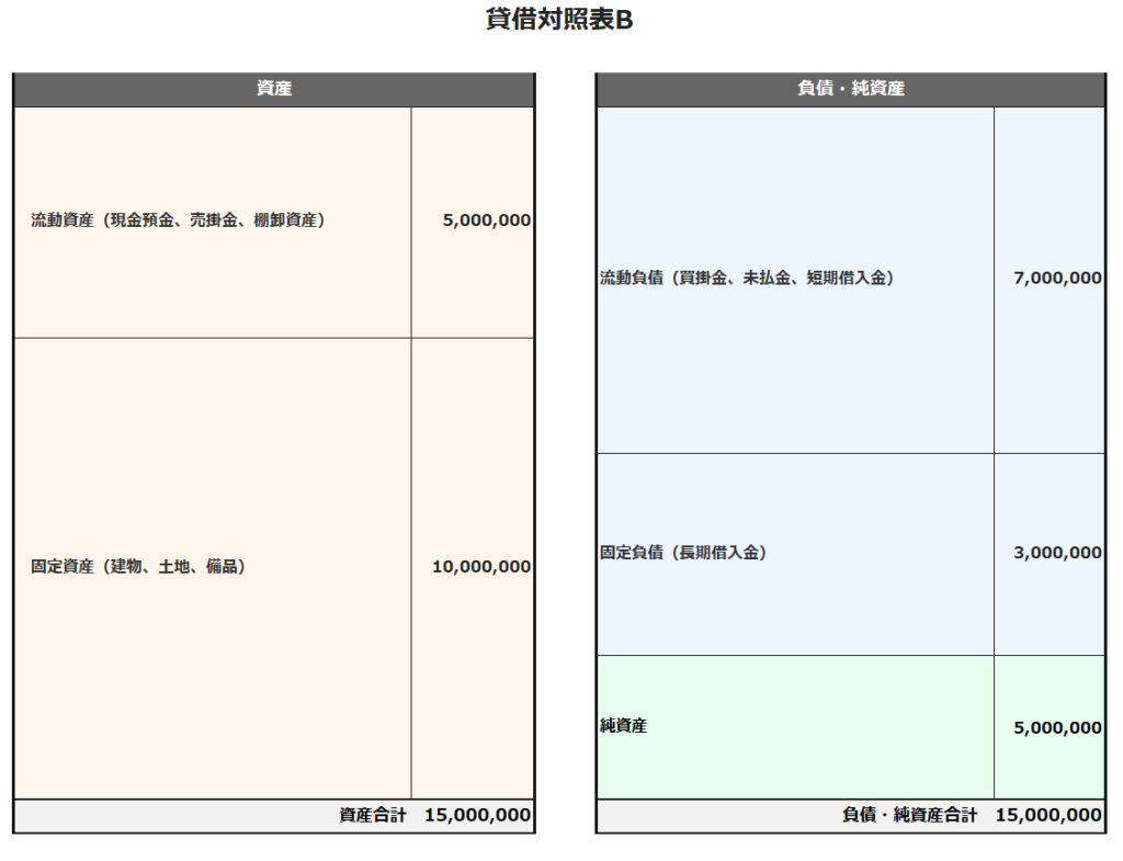 反対に、固定資産(建物・土地など)が多く、流動負債(買掛金・未払金など)が膨らむと、