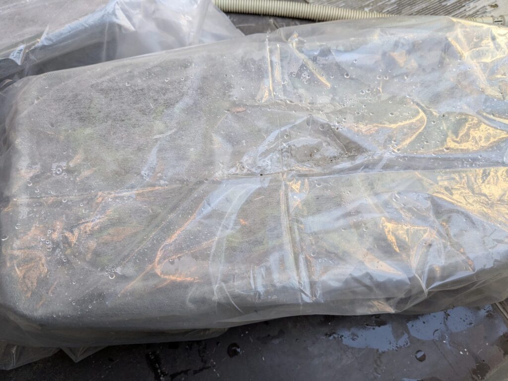 そこで、不織布をかぶせ、ポリ袋で覆い、簡易なビニールハウスを作成。